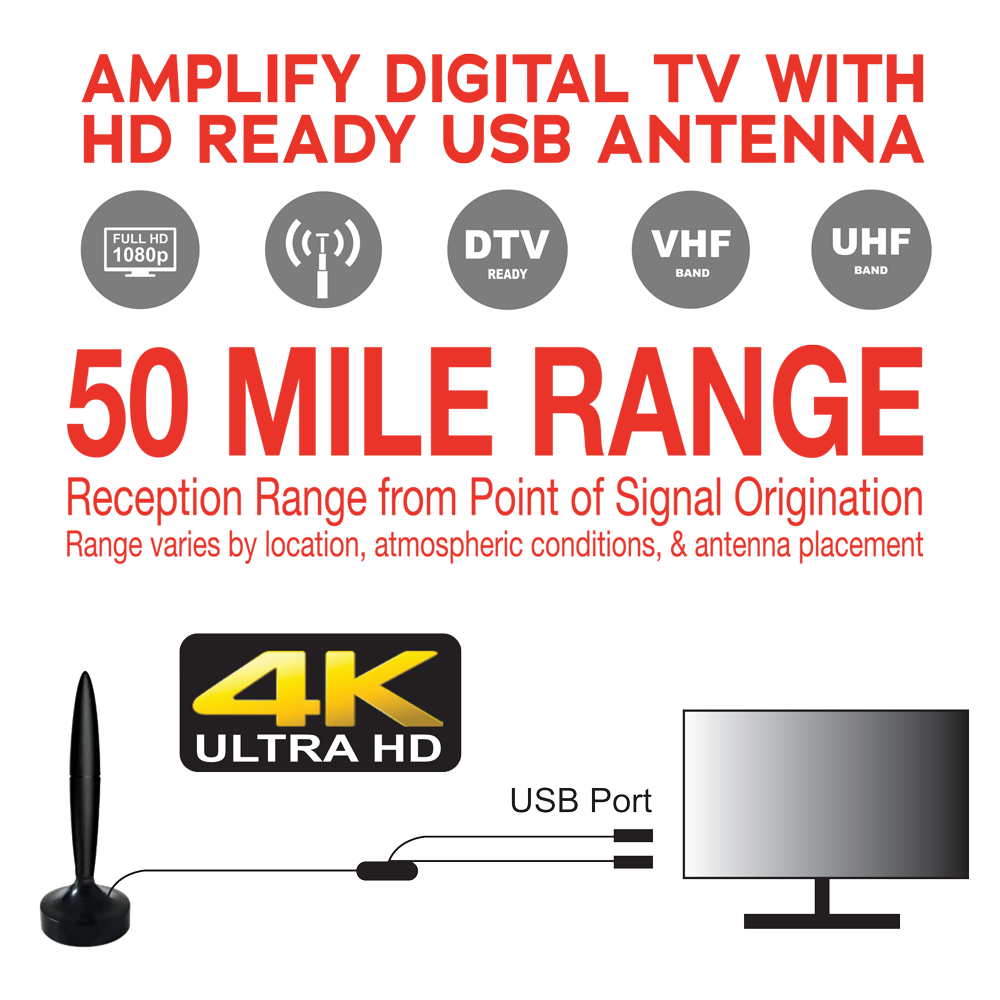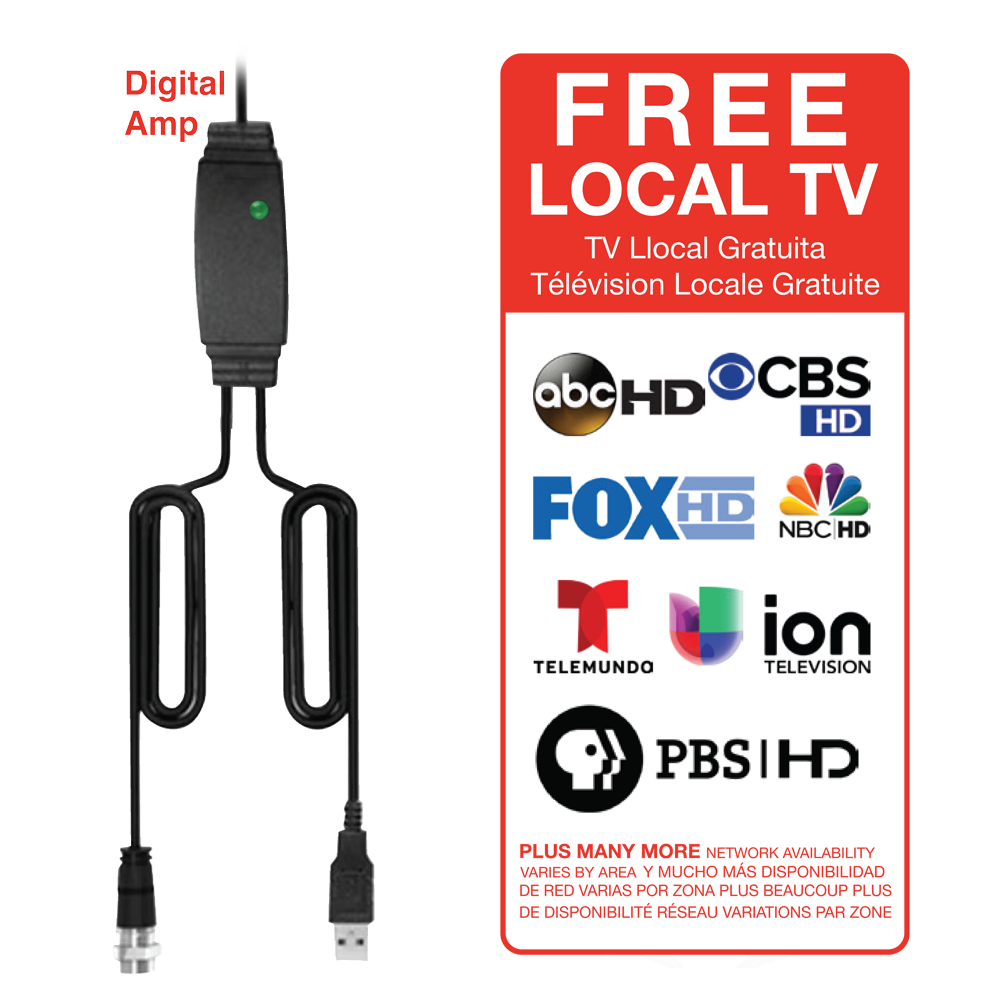 The ANT-36 is an amplified digital TV and HD-ready free over-the-air (OTA) TV antenna with magnetic mounting base and 10’ coaxial antenna cable. Watch free local TV channels and your favorite shows. It offers 25dB high gain reception and supports HD, DTV, VHF, UHF, HDTV signals. And the magnetic base can be mounted either horizontally or vertically for optimal placement.