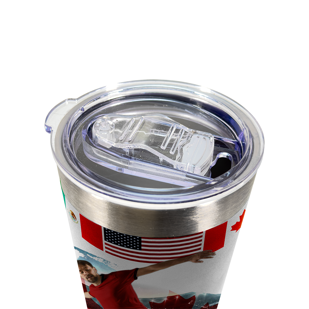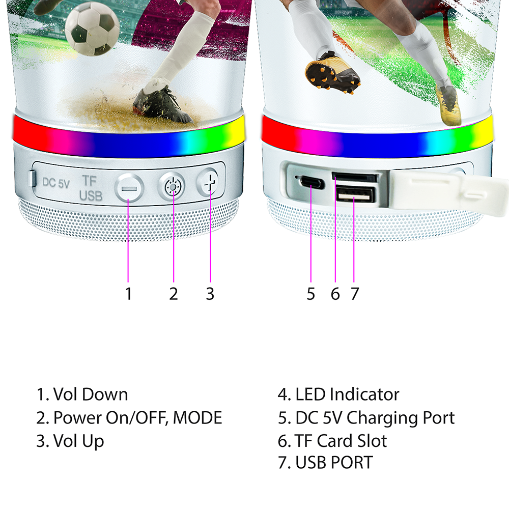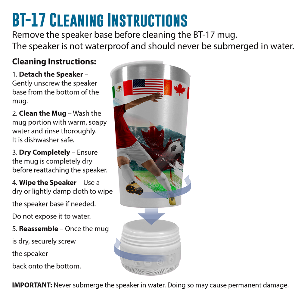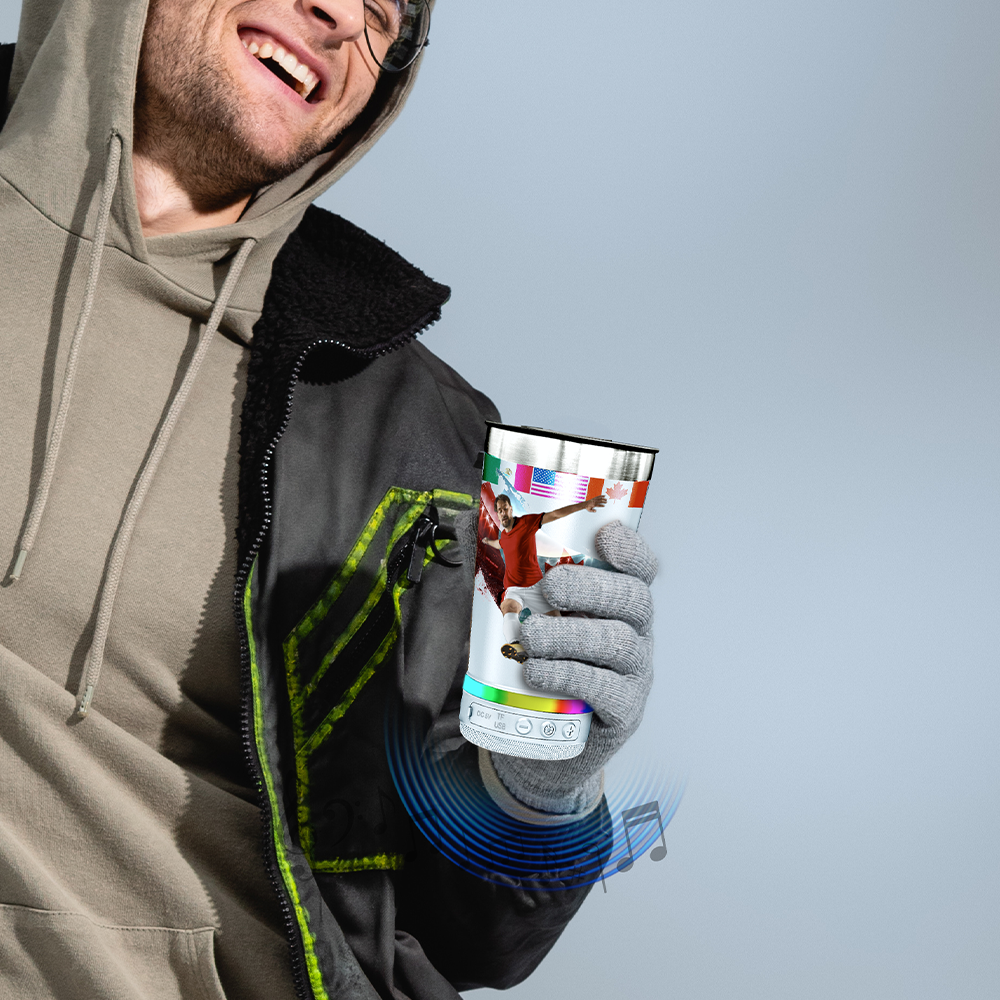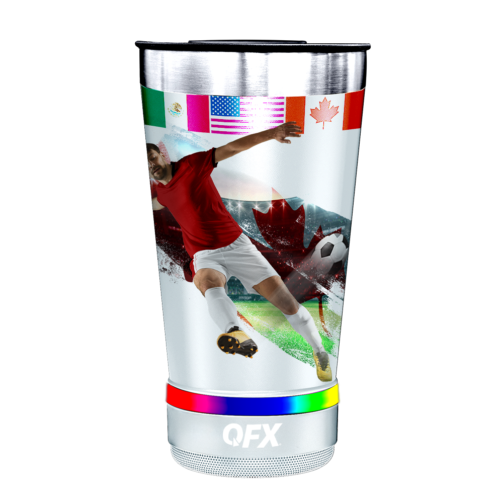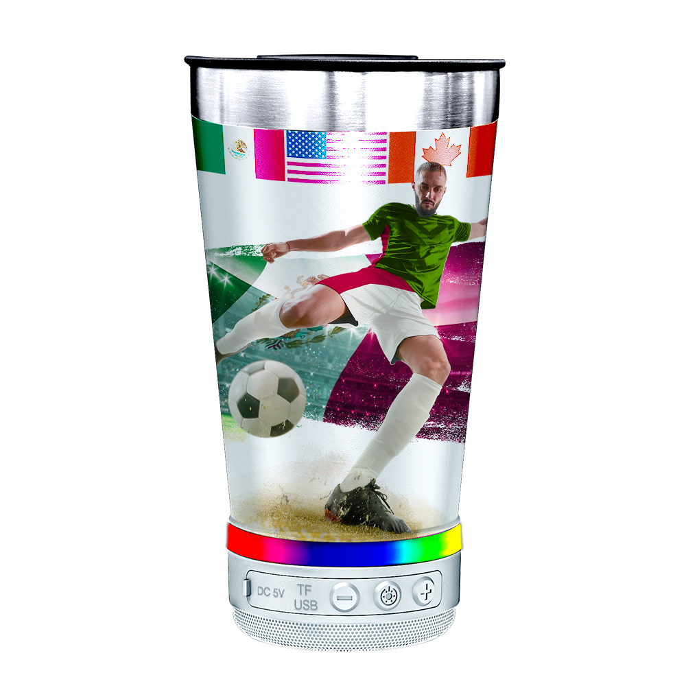 The BT-17 Limited Edition is a 16 oz stainless steel insulated Bluetooth speaker mug featuring multi-color LED lights and exclusive soccer-themed graphics created for the World Cup.