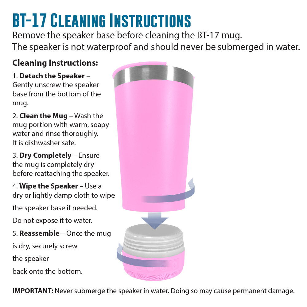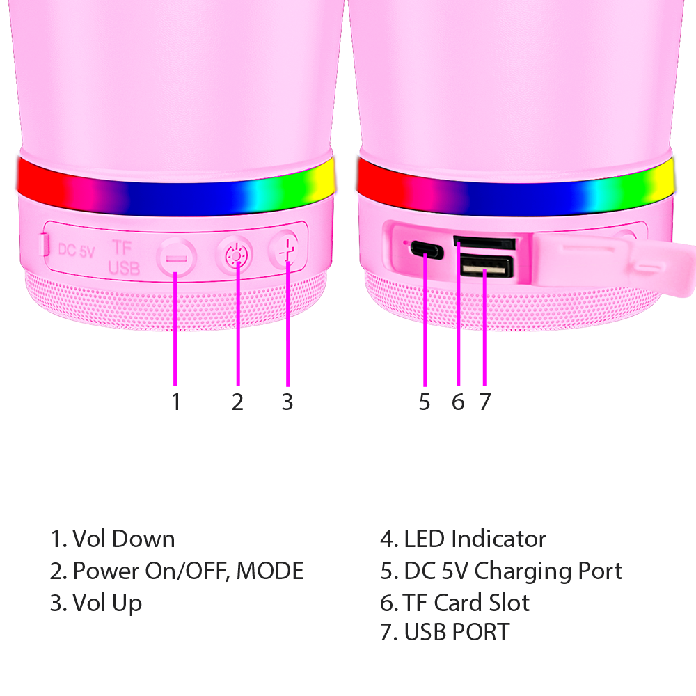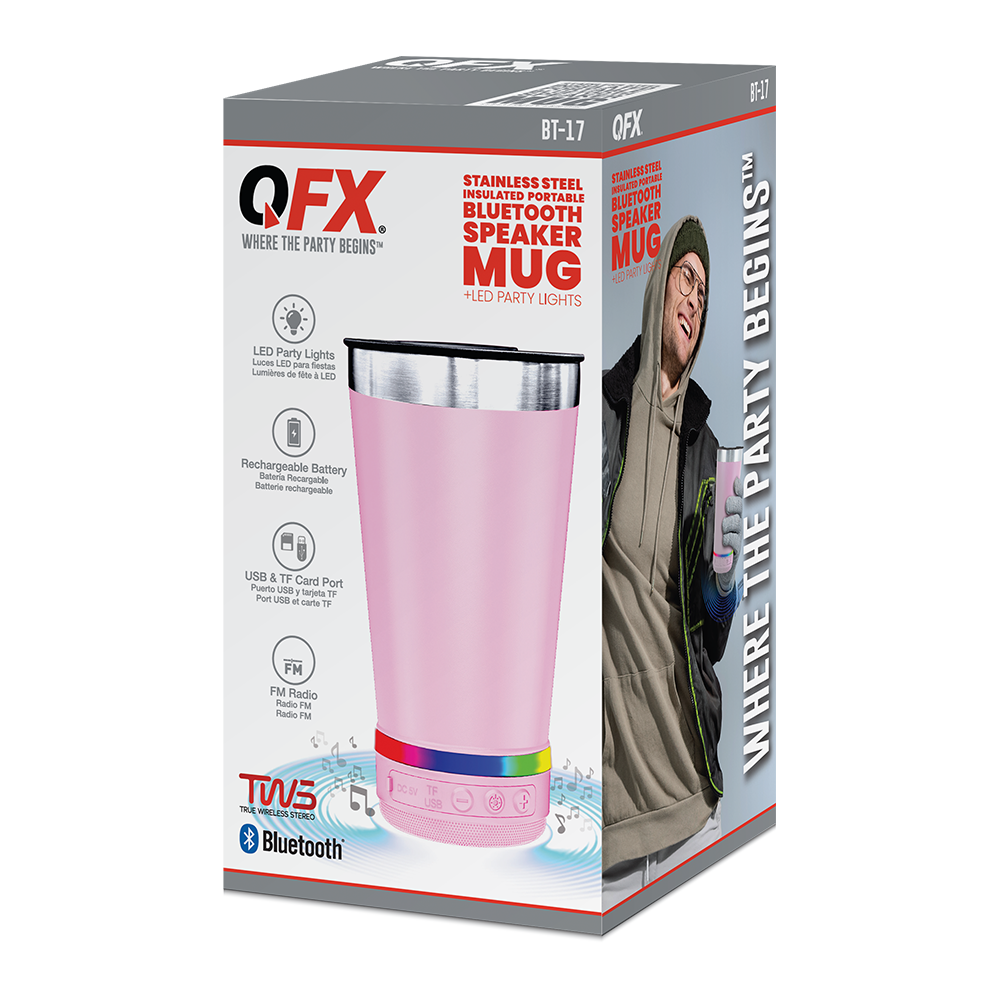 The BT-17 is a stainless steel, 16.oz insulated mug with built-in Bluetooth speaker and multi-color LED lights. Enjoy hot or cold drinks while listening to your favorite tunes. Stream music or podcasts on the go. The insulated mug will keep beverages hot or cold – whether it’s your morning coffee or a refreshing cold drink later in the day. Relax at home, work or outdoors while listening to the favorite streaming music over Bluetooth, or FM radio or play MP3 files from the USB drives or TF cards. Add a second BT-17 and experience True Wireless Stereo (TWS) sound.