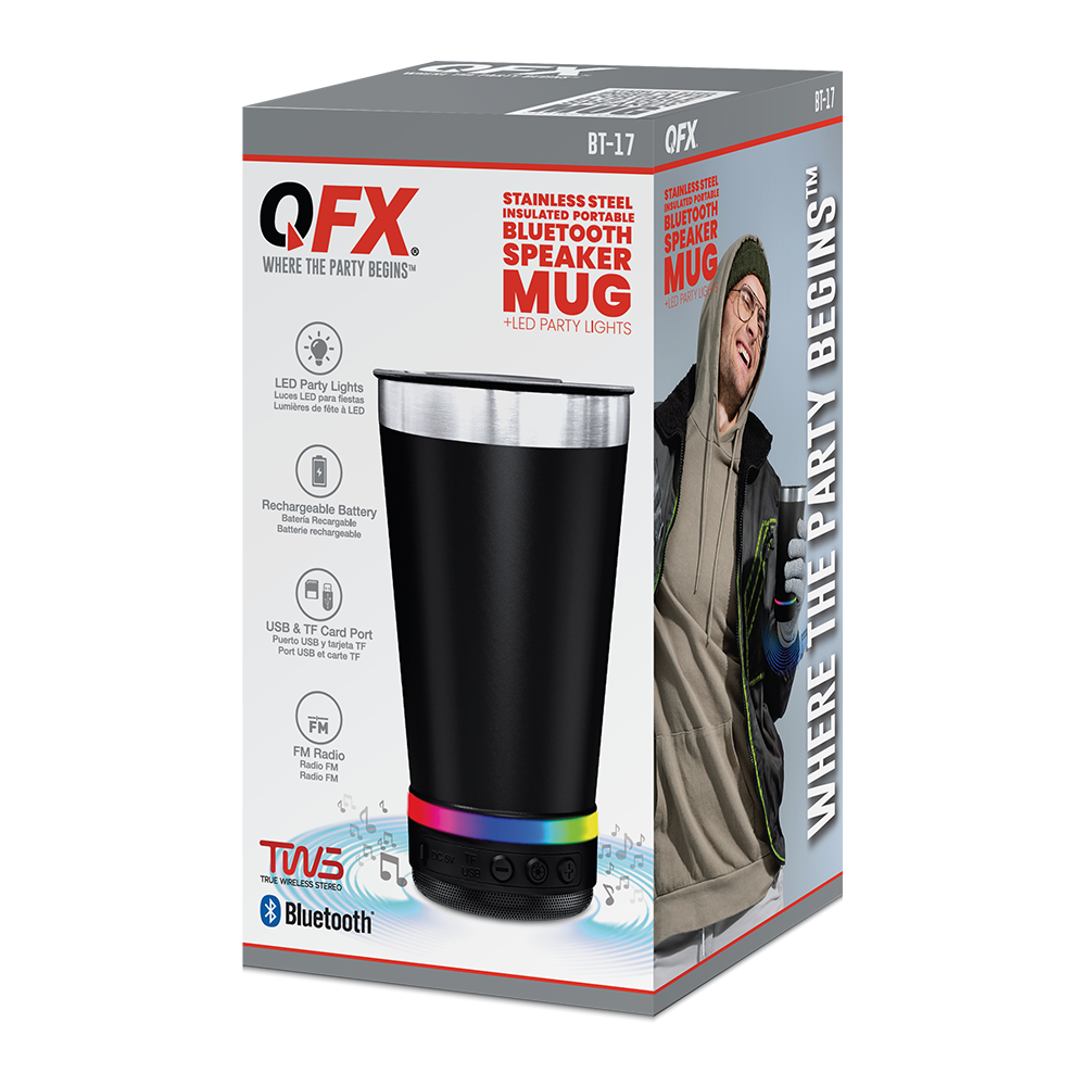 The BT-17 is a stainless steel, 16.oz insulated mug with built-in Bluetooth speaker and multi-color LED lights. Enjoy hot or cold drinks while listening to your favorite tunes. Stream music or podcasts on the go. The insulated mug will keep beverages hot or cold – whether it’s your morning coffee or a refreshing cold drink later in the day. Relax at home, work or outdoors while listening to the favorite streaming music over Bluetooth, or FM radio or play MP3 files from the USB drives or TF cards. Add a second BT-17 and experience True Wireless Stereo (TWS) sound.