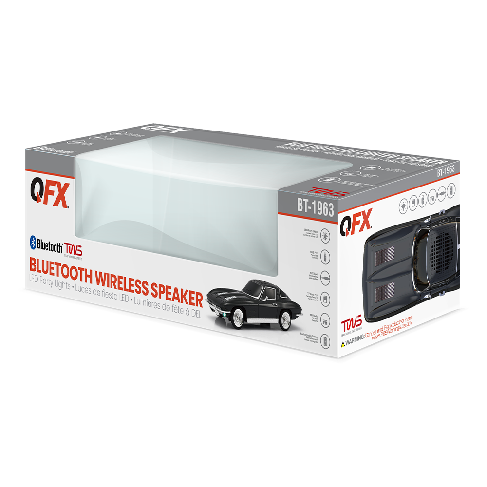 The QFX BT-1956 is a 1950s era American truck-inspired portable, rechargeable, Bluetooth speaker with LED party headlights and taillights that appeal to multi-generational families. It introduces a retro-design style and aesthetic along with the conveniences afforded to it by modern technology. Simply put, the BT-1956 will take you back to the future and beyond!