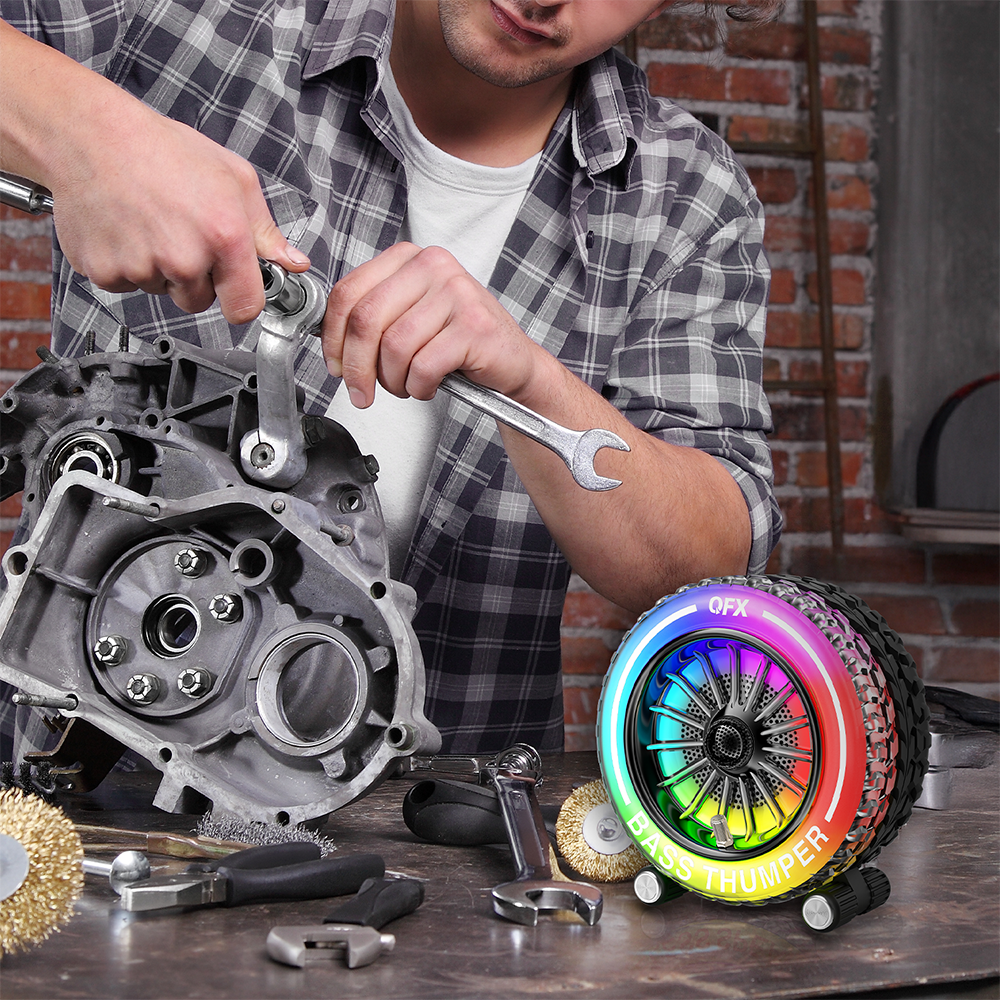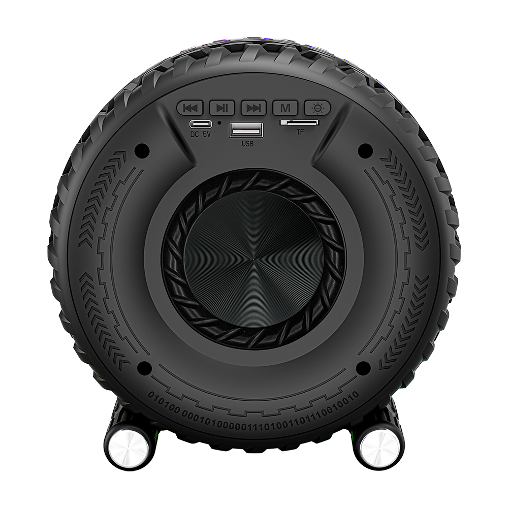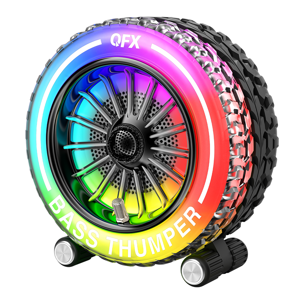 Inspired by off-road adventuring, the BT-230 is a tire-inspired rechargeable Bluetooth speaker with Bass Thumper sound! It boasts a full-range speaker with pulsating, deep bass punch. Built-in multi-color LED party lights all around the wheel let you know the party is starting now. Connect your mobile device via Bluetooth and stream your favorite tunes. Enjoy FM radio or play MP3 songs from USB drives or TF cards. For an even richer audio experience, add a second BT-230 and enjoy True Wireless Stereo (TWS) sound. Experience an all-terrain ride down the road with an exciting music and light show!