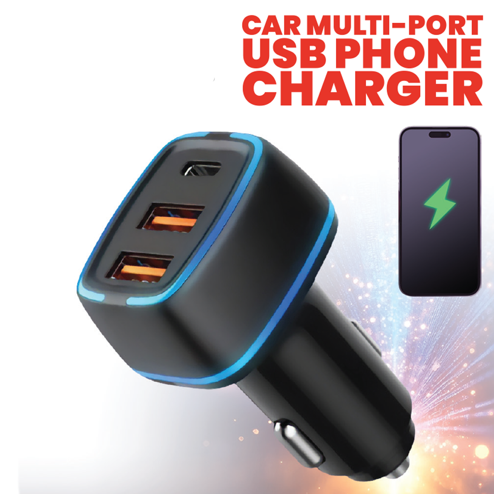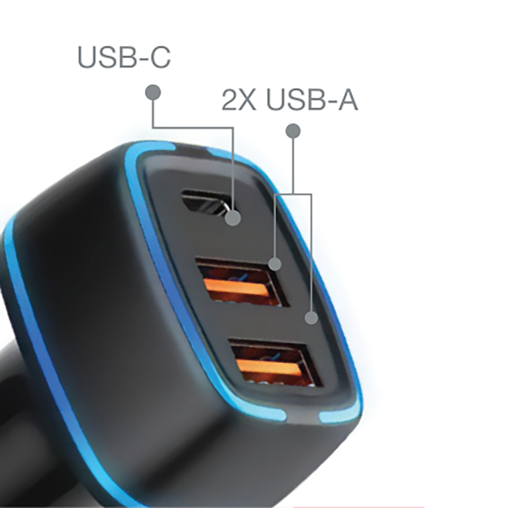 The CC-10 car phone charger is a compact, high-efficiency charger featuring two USB-A ports and one USB-C port for simultaneous charging of multiple devices. Simply plug it into any 12–24VDC car cigarette lighter socket. It includes a built-in LED indicator and supports most phone models with a maximum output of 5V/3A. Its ultra-compact design saves space and keeps your dashboard easily accessible.
