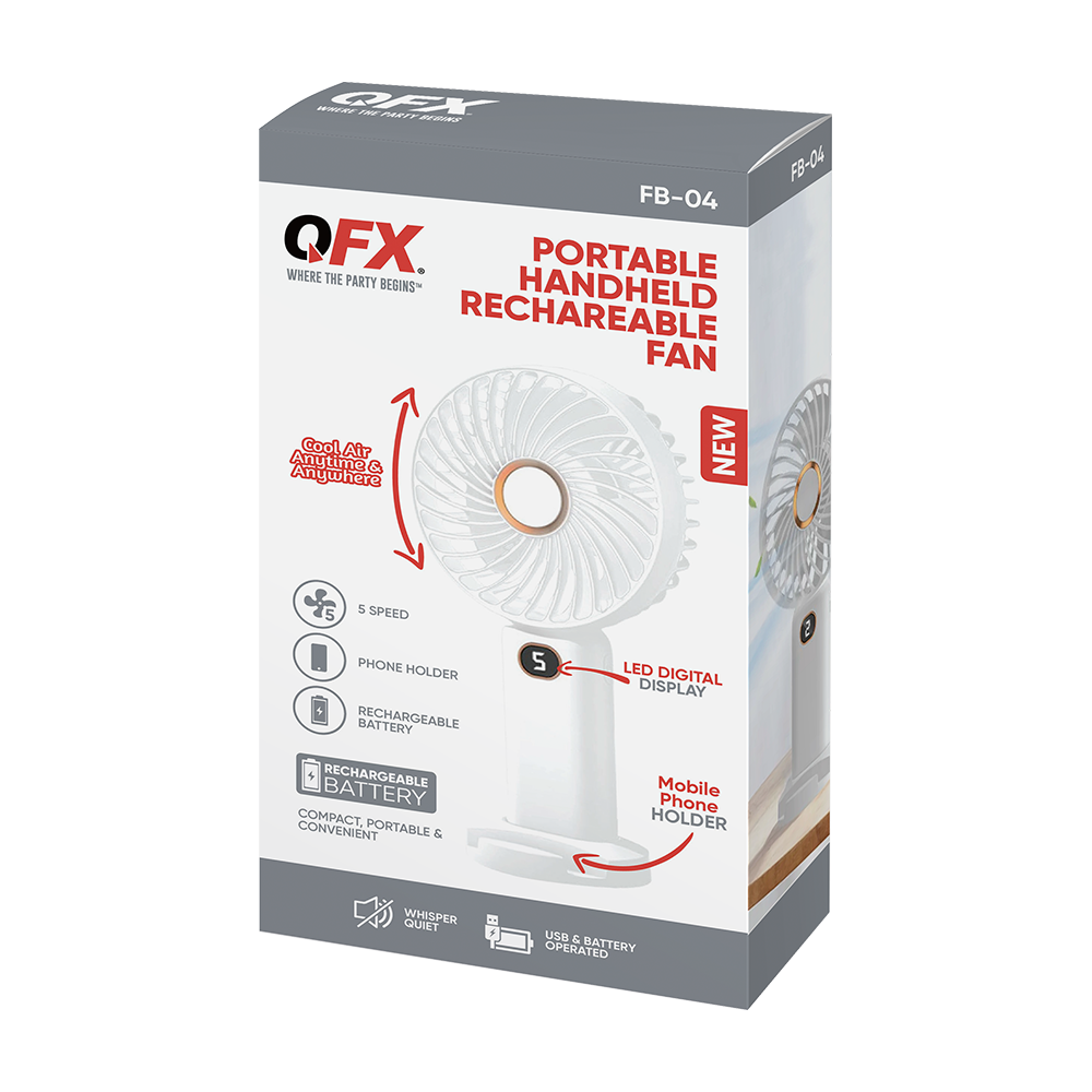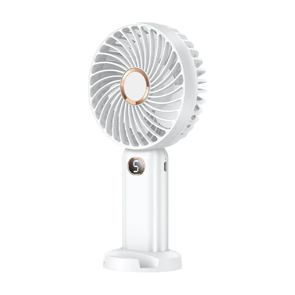 Stay cool and connected with this versatile handheld fan designed for life on the go. Its bright LED display makes speed settings easy to read, while the built‑in mobile phone holder adds hands‑free convenience wherever you are. With five adjustable speeds, a rechargeable battery, and a compact, lightweight design, it delivers personalized cooling in a portable package. Includes a USB cable for quick, easy charging.
