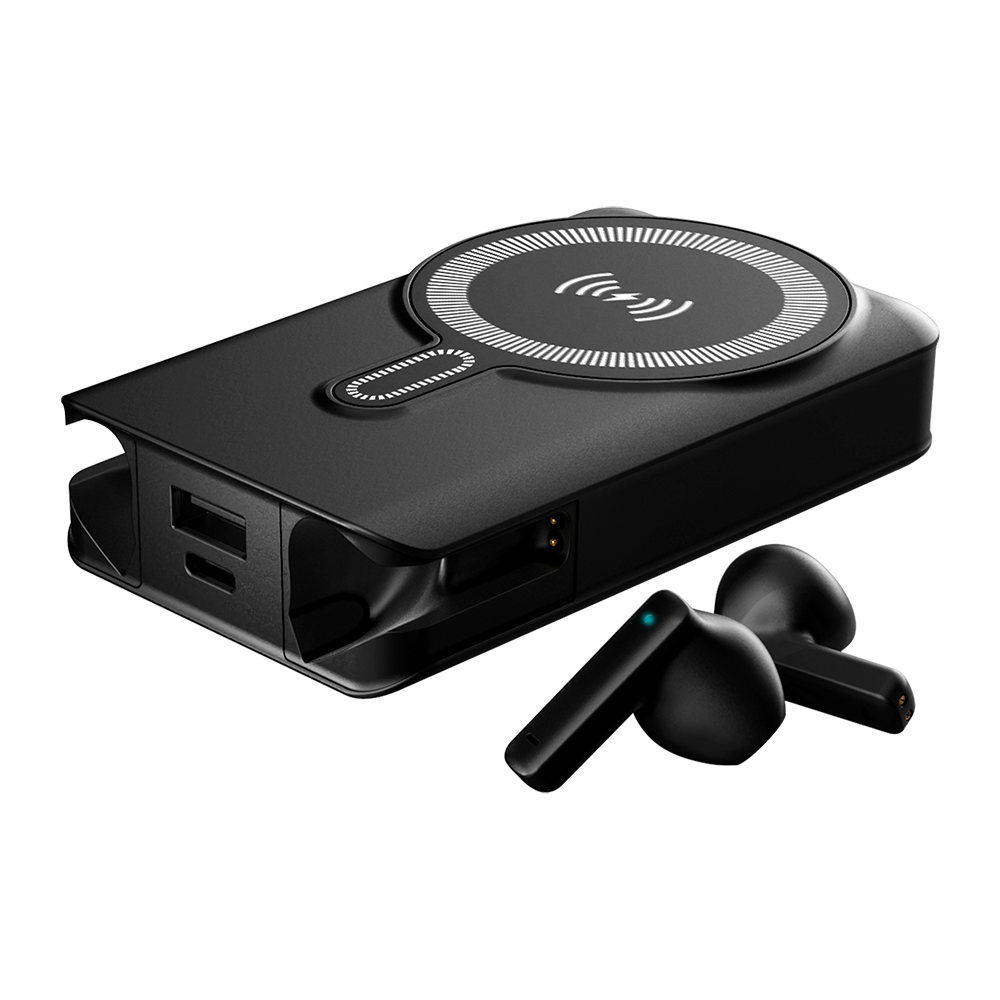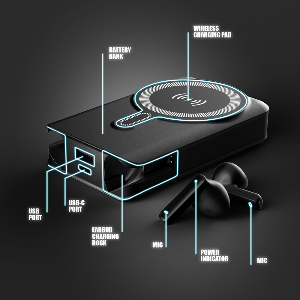 RECHARGEABLE BLUETOOTH TWS EARBUDS + CHARGING CASE WITH WIRELESS PHONE CHARGING PAD AND WIRED PHONE CHANGING