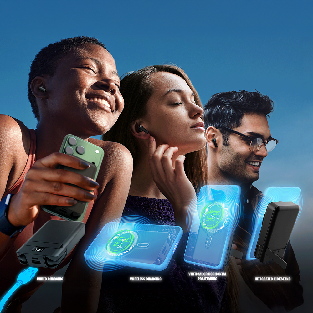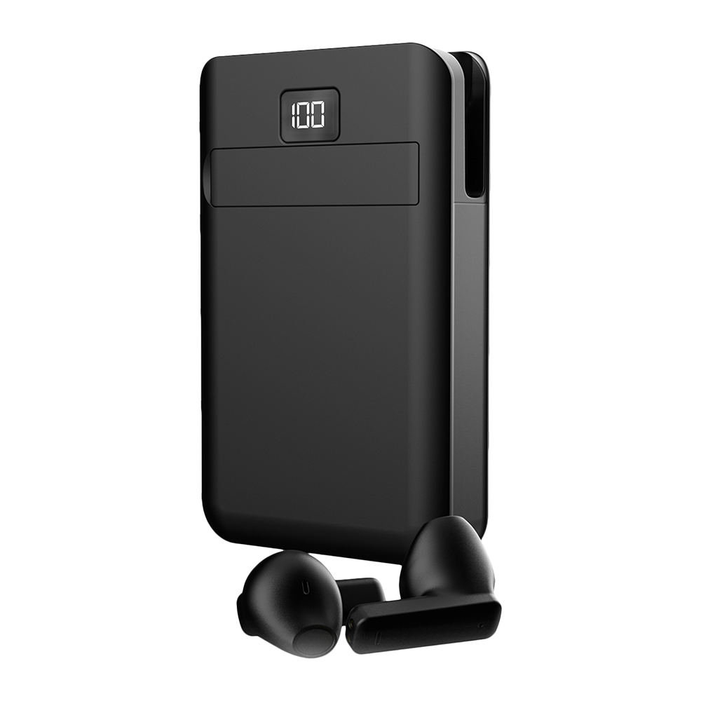 The HP-E200 True Wireless Sound (TWS) earbuds with charging case that feature dual functionality. It also has an integrated wireless phone charging pad and a wired USB phone charging output. It delivers superb sound quality for voice clarity as well as full range music playback. It features on-ear touch controls for phone calls and music playback. Advanced Bluetooth technology provides fast, stable, line of site connectivity within a 30’ Bluetooth range. A simple pairing process allows you to connect your earbuds to your Bluetooth-enabled mobile phone with ease. Once paired, the earbuds will auto-connect to the same phone on its next use. On a full charge, the earbuds can play up to 4 hours. Plus, the earbuds can be recharged multiple times from a fully charged charging case while traveling on the go. The LED display shows the charging case battery level. A pull-out kick stand offers optional desktop setup. The package includes two wireless earbuds, charging case/pad, and USB-C cable.