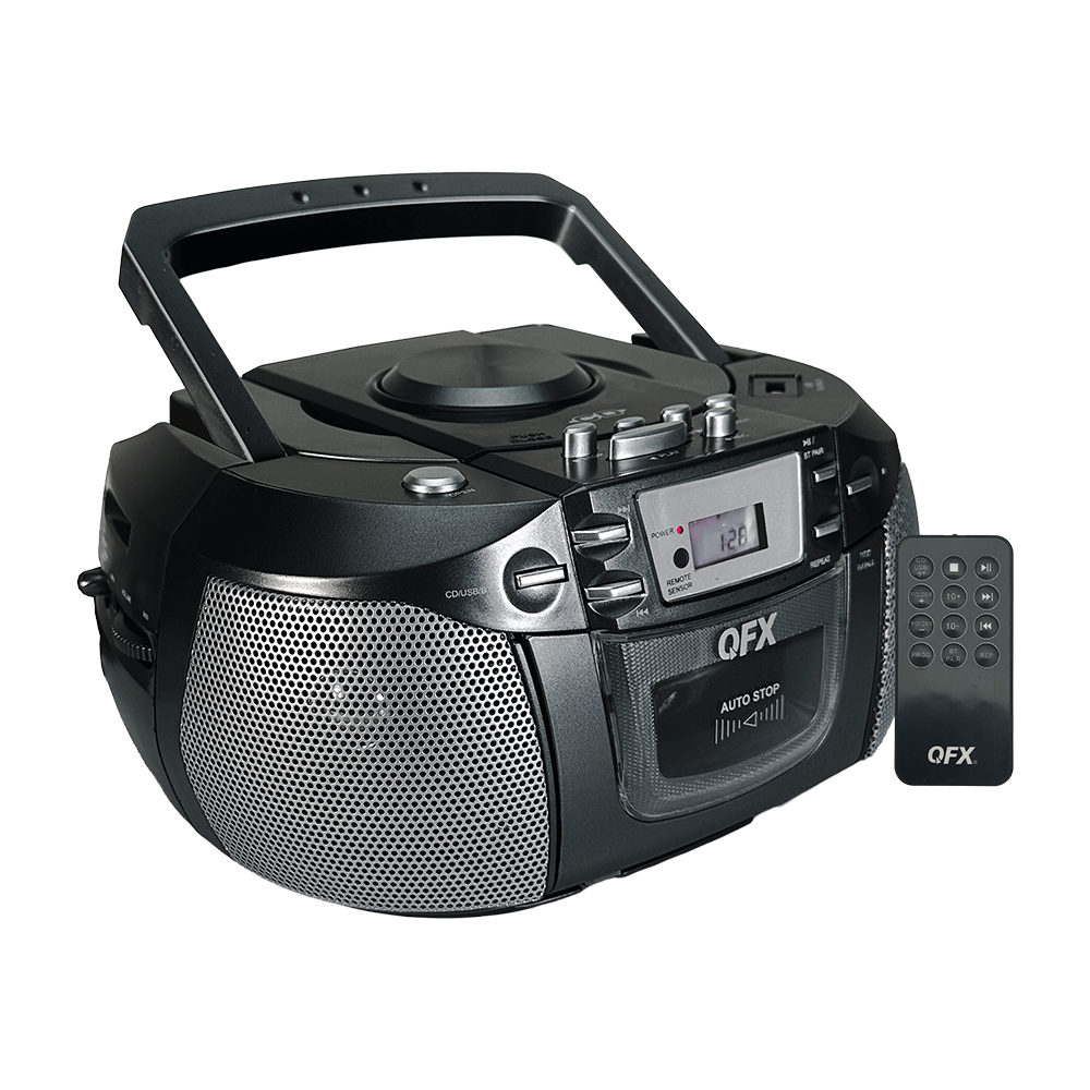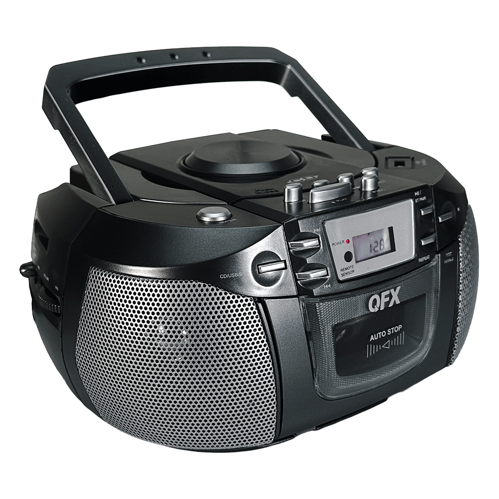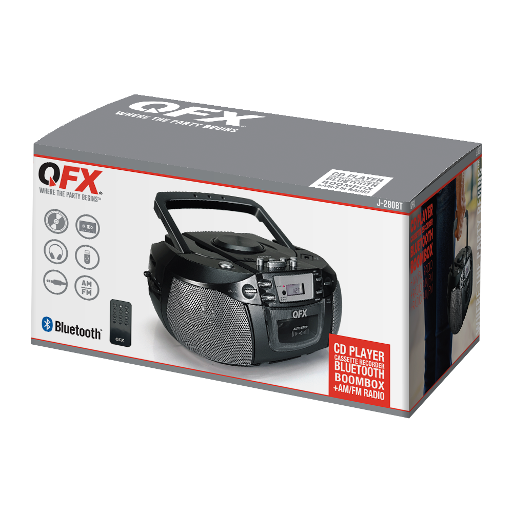 The J-290BT is a versatile portable boombox built for music lovers who enjoy mixing old‑school charm with modern convenience. Its top‑loading CD player includes a 20‑track programmable memory, while the built‑in cassette deck lets you play classic tapes or record your own custom mixes from multiple sources—CD, Bluetooth, AUX, USB or AM/FM radio. With Bluetooth audio streaming, you can wirelessly enjoy playlists from your compatible device, and the AUX input offers an easy way to connect portable audio players. A headphone jack is included for private listening whenever you want it. The adjustable telescoping antenna helps you lock in clear radio reception, and you can power the J-290BT using a standard AC outlet or six “C” batteries for true indoor‑outdoor flexibility. A convenient swivel handle makes carrying it from room to room—or out into the world—effortless.