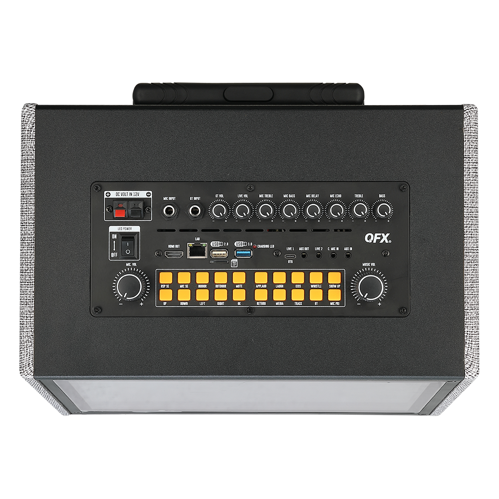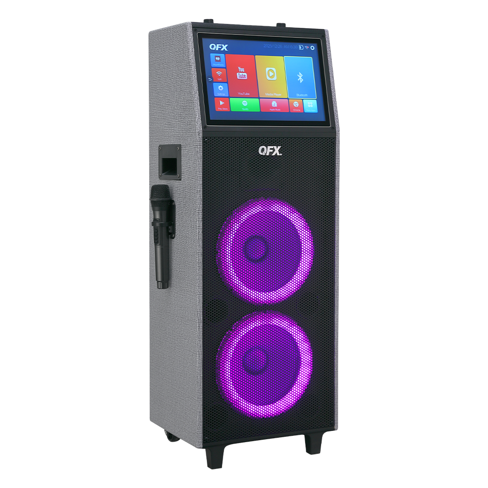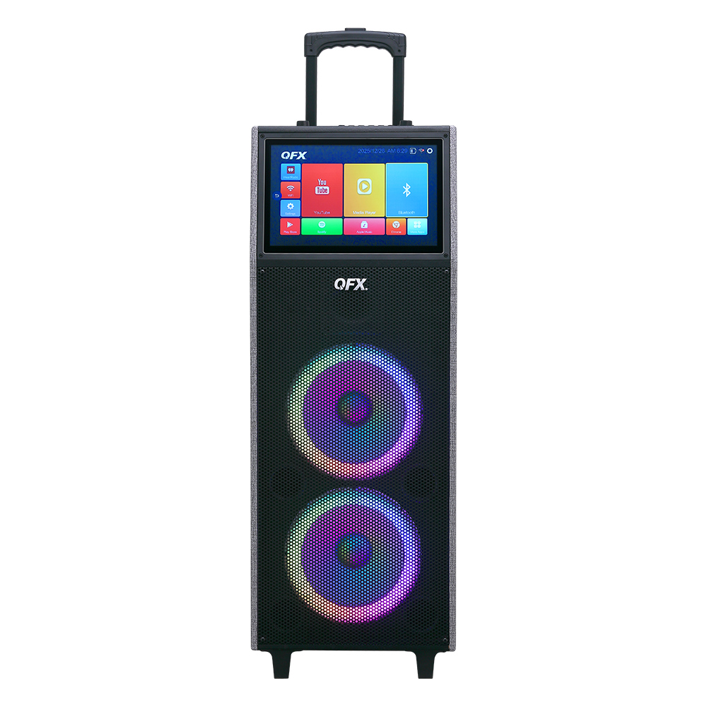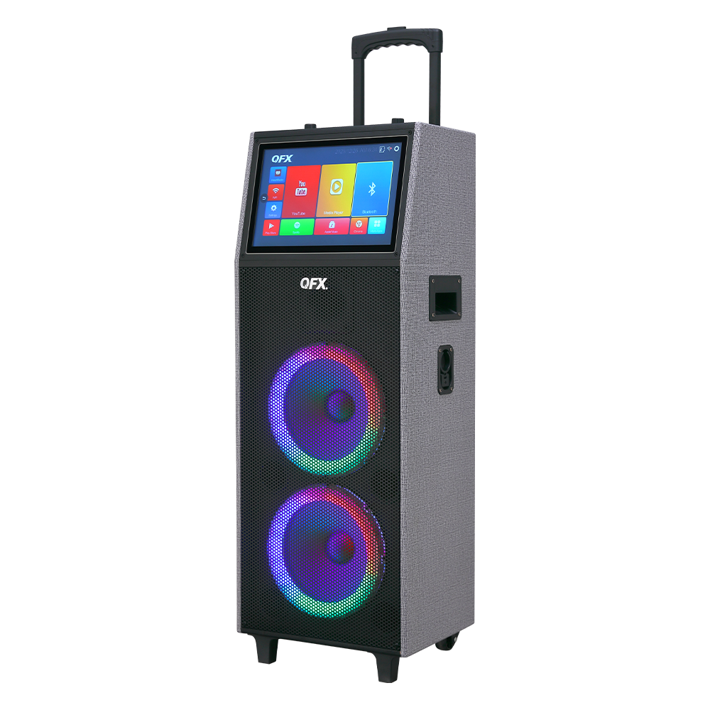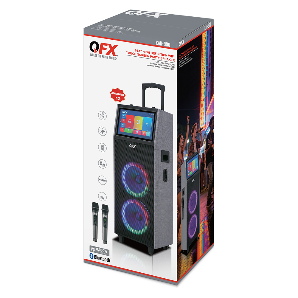 The KAR-990 is the ultimate entertainment hub wherever you go. It features a Wi-Fi wireless or Ethernet LAN-enabled high definition 14.1″ LED touchscreen as well as a full function remote control for easy navigation. Designed for parties, events, karaoke nights, and on‑the‑go performances, it combines booming audio, smart features, and a fully interactive display—all in one portable, rechargeable travel‑ready unit. It operates on Android V12.0 or from Ethernet RJ45 LAN connectivity for access to your favorite apps, videos, and music right at your fingertips. Stream, browse, or play content effortlessly over 5G‑capable Wi-Fi or Bluetooth, giving you smooth, modern connectivity wherever you set up. Feel the power of the dual 10″ woofer and 2” tweeters, delivering deep bass and room‑filling sound enhanced by treble and bass controls so you can fine‑tune your audio. Add some flair with LED RGB party lights that bring color and energy to any space. Whether you’re hosting karaoke or giving a presentation, the wireless microphones—complete with mic echo, delay, treble, bass and volume controls—keeps your voice clear and dynamic. Control built-in sound effects to keep the party jumping. With microphone, guitar and AUX input, HDMI output and a USB/TF music player, you can connect to and from a wide range of devices. The rechargeable battery keeps the party going without being tied to an outlet, and the built-in handles and wheels make it effortless to roll from room to room or venue to venue. For extended periods away from a power source, it also allows for external 12VDC power inputs. KAR-990 brings Big Sound, Big Screen and Big Fun.