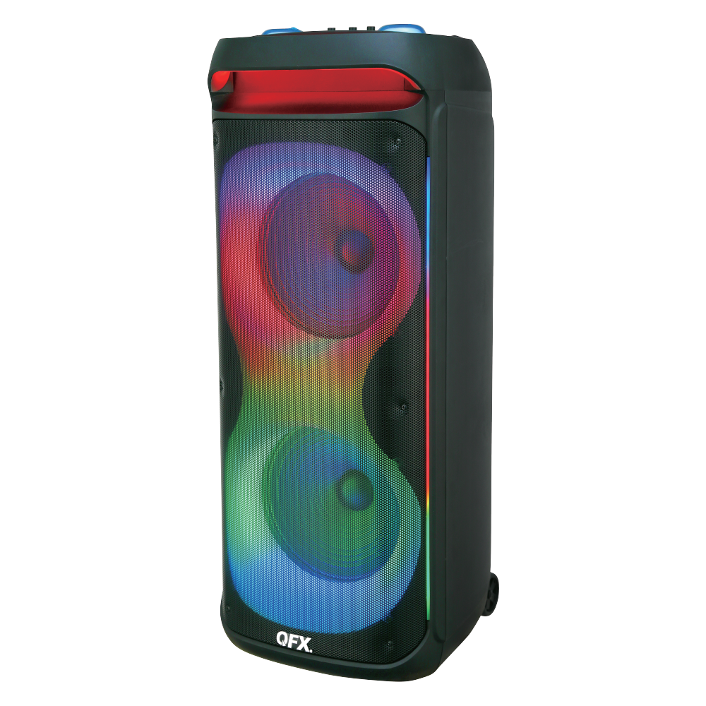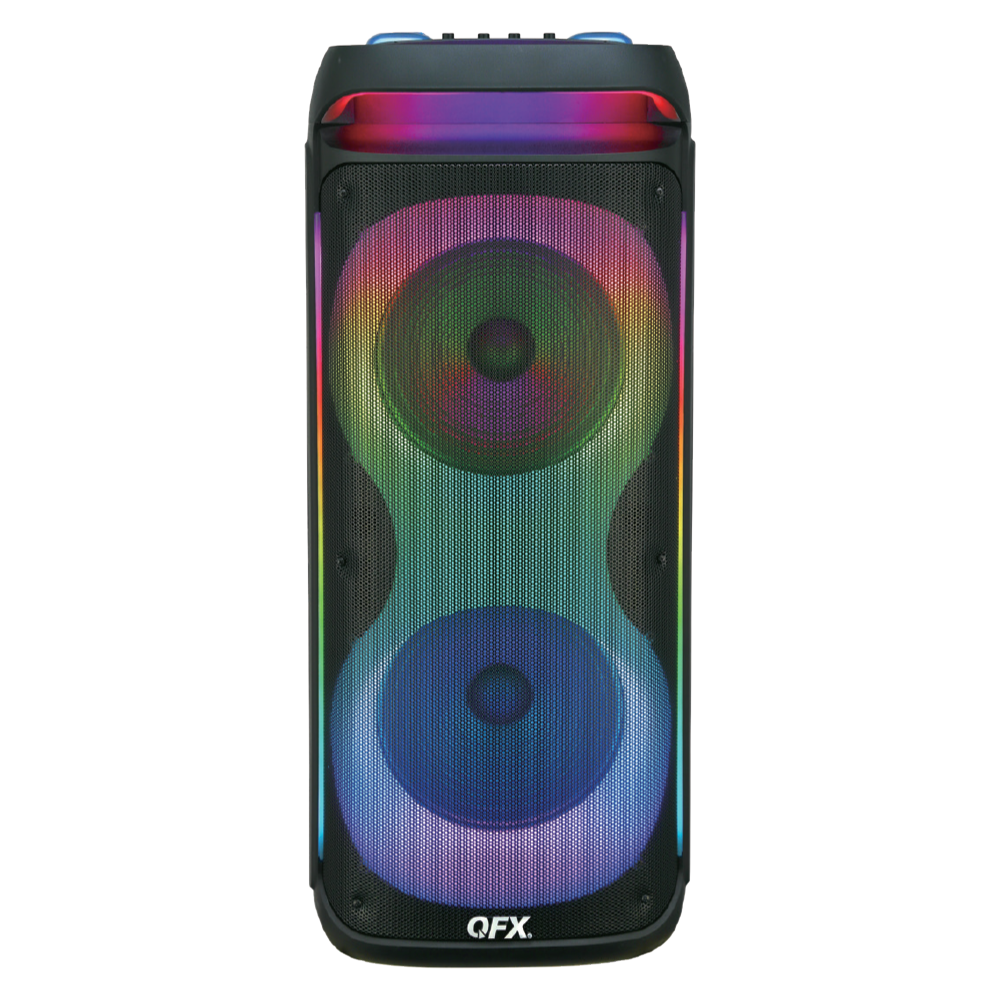 The QFX PBX-2122 is a dual 12” woofer with a 1.5” tweeter, rechargeable party speaker with two wireless microphones and a remote control. Take your party to new entertainment heights with bigtime sound plus multi-color LED lights which produce a dramatic visual show. Play music from a variety of sources including Bluetooth-enabled devices, music stored on USB drives, TF cards or connect an external audio player to the AUX input. In addition to the included wireless microphones, you can also plug in up to two wired microphones as well as a guitar for the ultimate live music or karaoke performance. It has an integrated top handle with rugged wheels for easy transportation. Add a second PBX-2122 and enjoy True Wireless Stereo (TWS) sound.