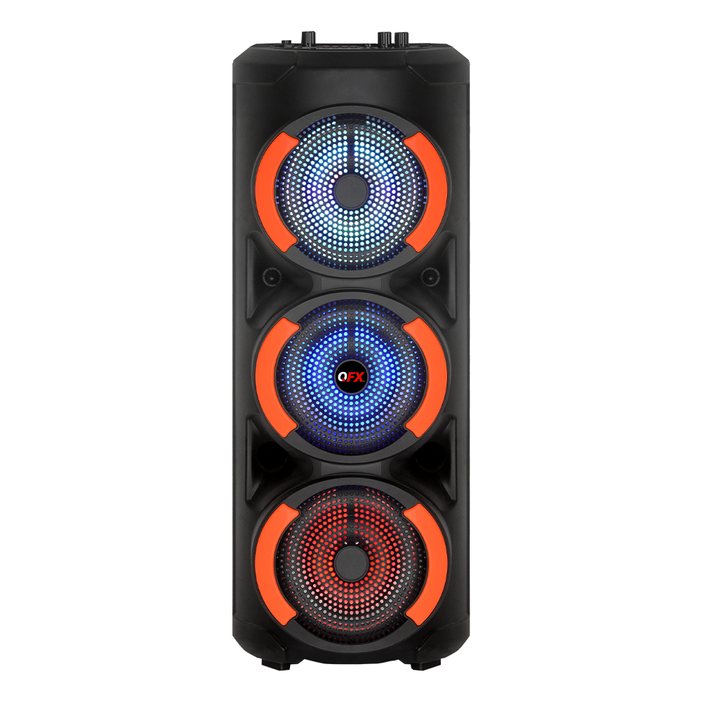 The PBX-63 is a triple 6.5” party speaker that includes a wired microphone and remote control. It features multi-color LED party lights that are sure to jumpstart your party. Digital EQ and the onboard mic echo controls let you dial in just the right sound. Play music from a variety of sources including Bluetooth-enabled devices, FM radio or from music files stored on USB drives and TF cards. You can also plug in from your favorite audio device to the AUX input. Add a second PBX-63 and enjoy True Wireless Stereo (TWS) sound. The speaker can be transported with ease using the integrated top handle.