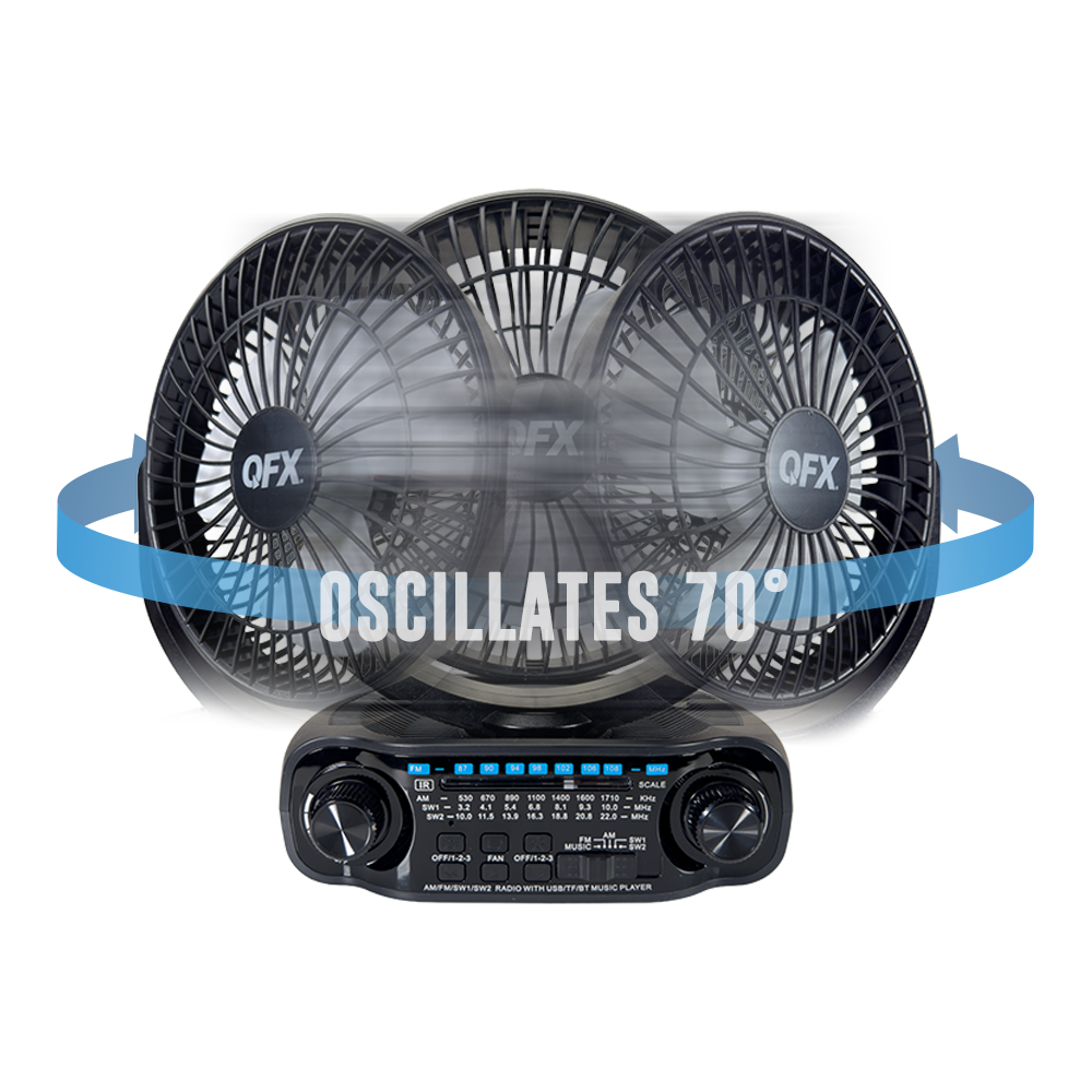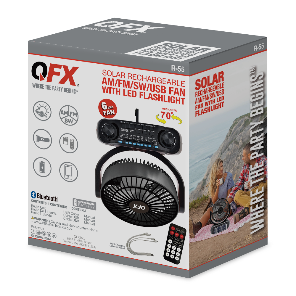 The R-55 is a solar and USB rechargeable powerful 6” adjustable cooling fan with built-in speaker and remote control. The 3-level LED floodlight, located behind the solar panel can be angle-adjusted for convenient emergency or task-related usage. Connect via Bluetooth to stream your favorite music through its built-in full range powered speaker. Enjoy music playback from USB/TF card files. Tune into music, talk and news and emergency alert radio while using its telescoping antenna for optimized radio reception. Plug in to the AUX input to connect from an external audio device. R-55 features a mounting hook underneath for attachment to task work area cabinets or in other convenient locations.
