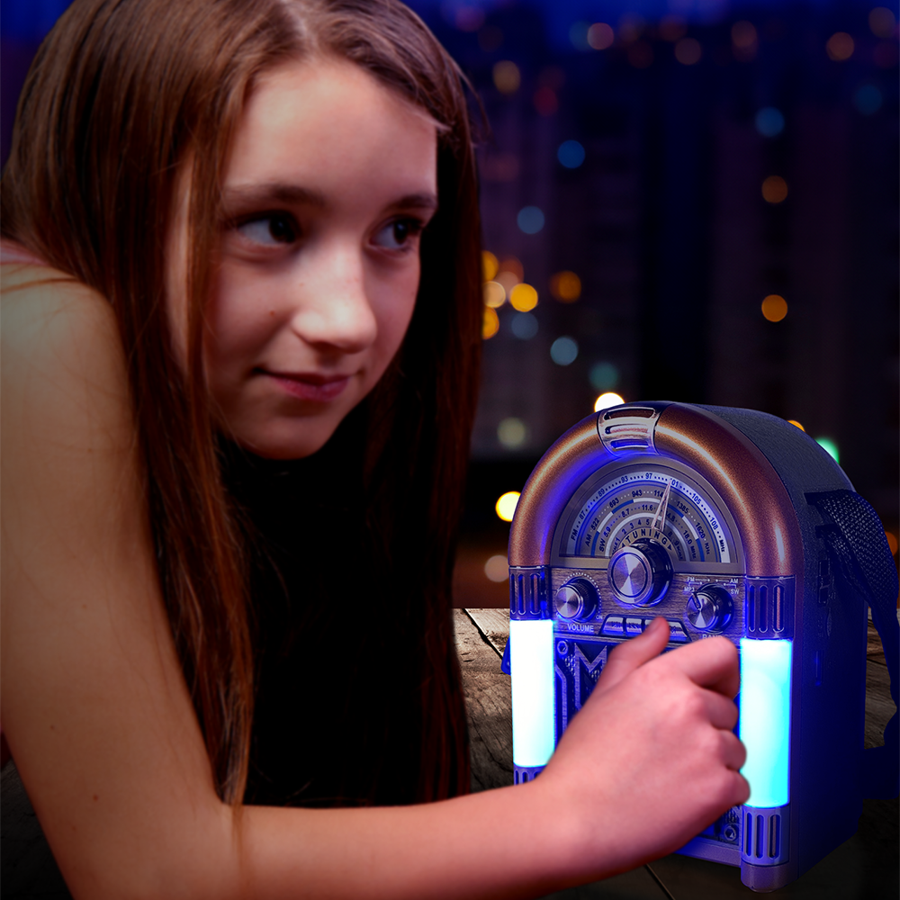 RETRO JUKEBOX-STYLE BLUETOOTH RECHARGEABLE 4-BAND RADIO AND LIGHTS