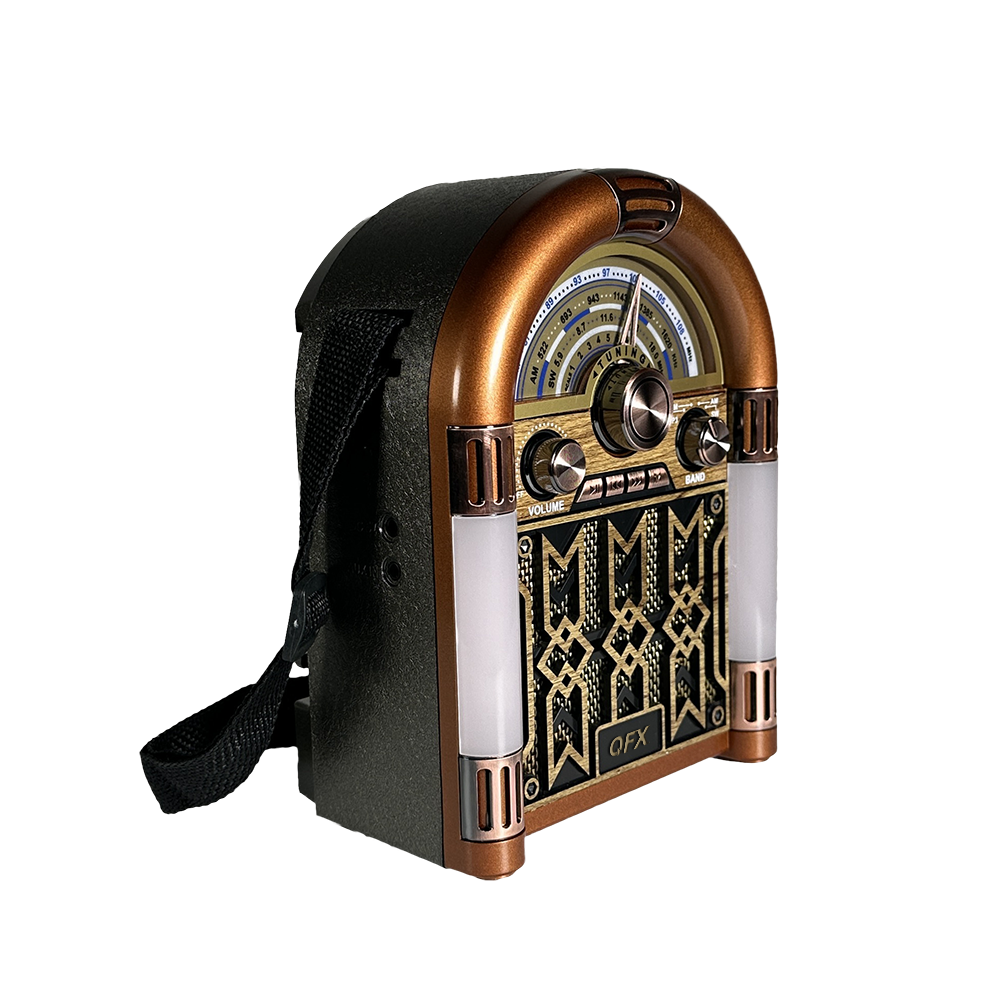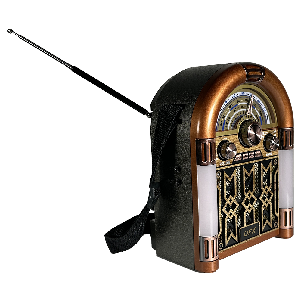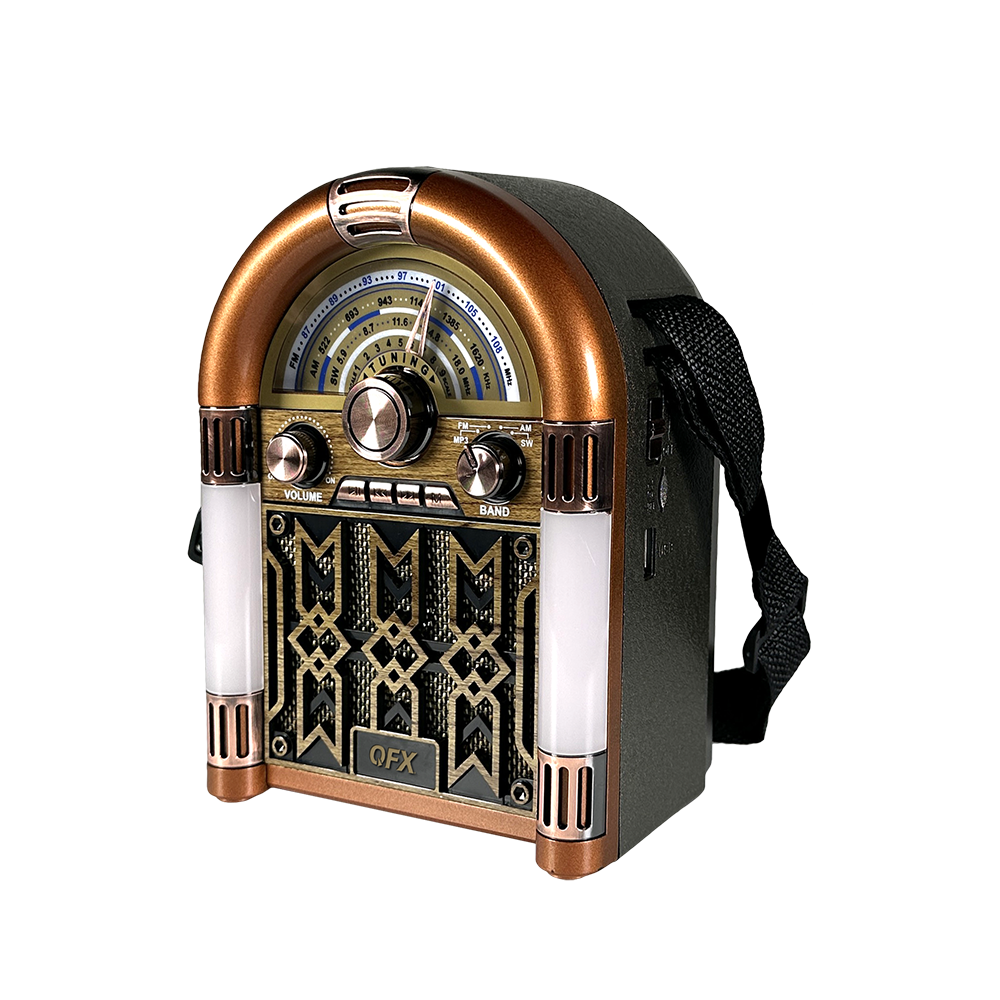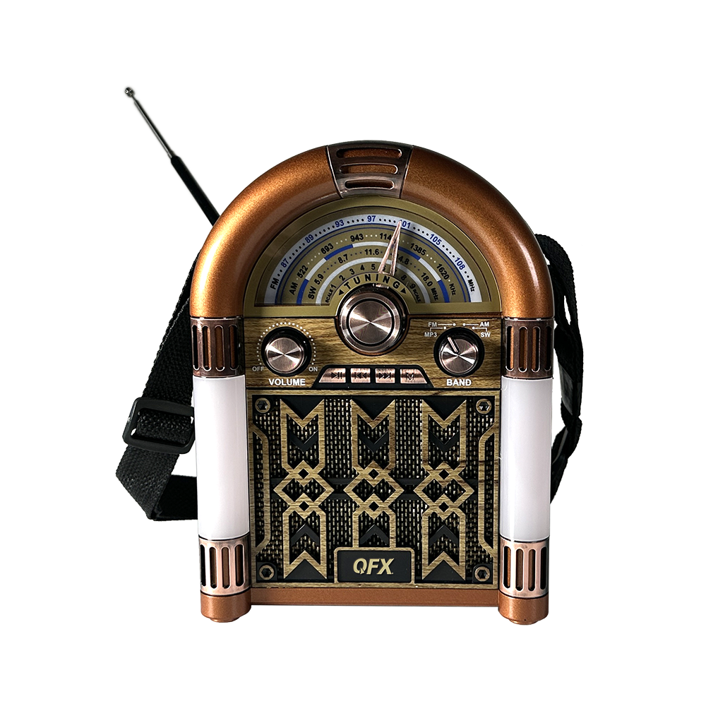 The QFX RETRO-1939 is a vintage Jukebox-styled 4-band AM/FM/SW1-2 radio with side flashlight. Stream music wirelessly from Bluetooth-enabled devices, play music files stored on USB drives and TF cards or connect your portable device to the AUX input. Tune into music, talk and news radio with a telescoping antenna for optimized radio reception. It can be recharged using the supplied USB cable and includes a convenient carrying strap for use on the go.