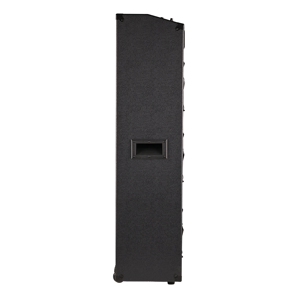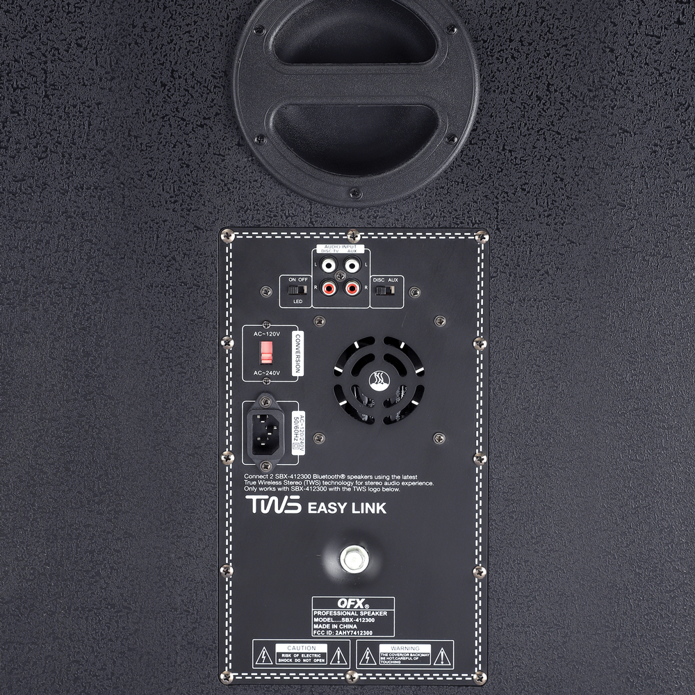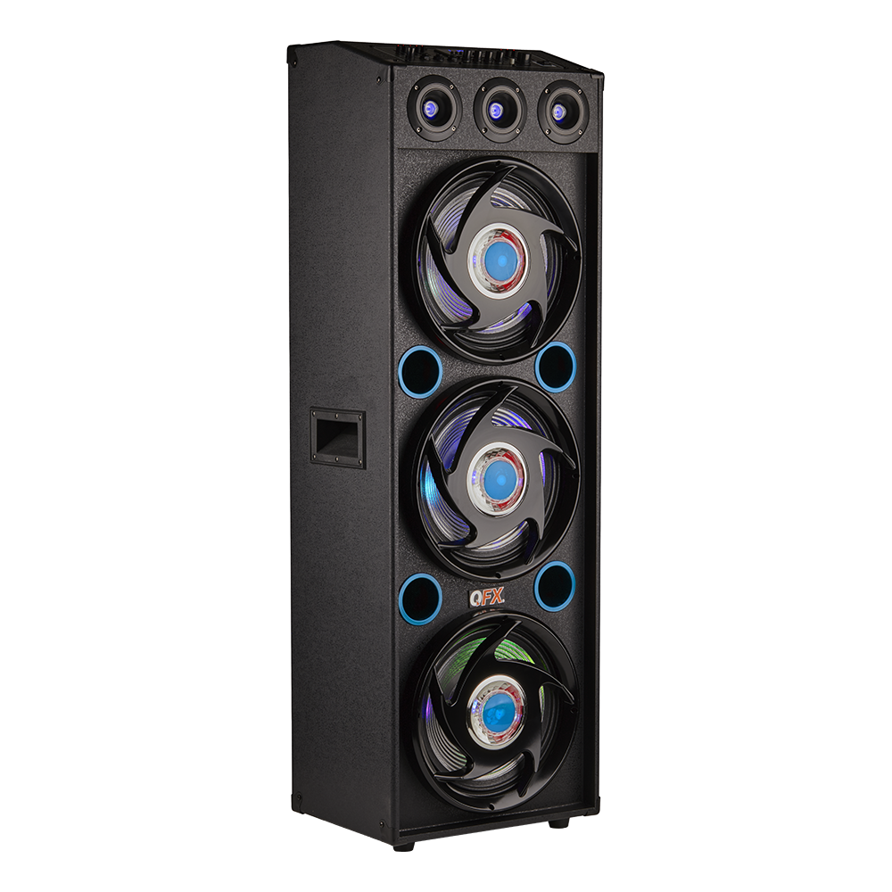 The QFX SBX-412207BT is a triple 12” woofers with three 1” tweeters, cabinet PA speaker with wheels and handles on both sides and in back. This system features LED party lights on front with dome RGB light on top. Connect a microphone and control them with mic bass, treble, echo and digital delay controls. It features a separate guitar input and volume control; great for performances or guitar practice. With two onboard 5-band graphic equalizers built in, you can dial in just the right sound. Play music from a variety of sources including Bluetooth-enabled devices, FM radio or from music files stored on USB drives and TF cards. You can also connect your favorite portable audio player directly to the auxiliary input. Add a second SBX-412207BT and enjoy True Wireless Stereo (TWS) sound.