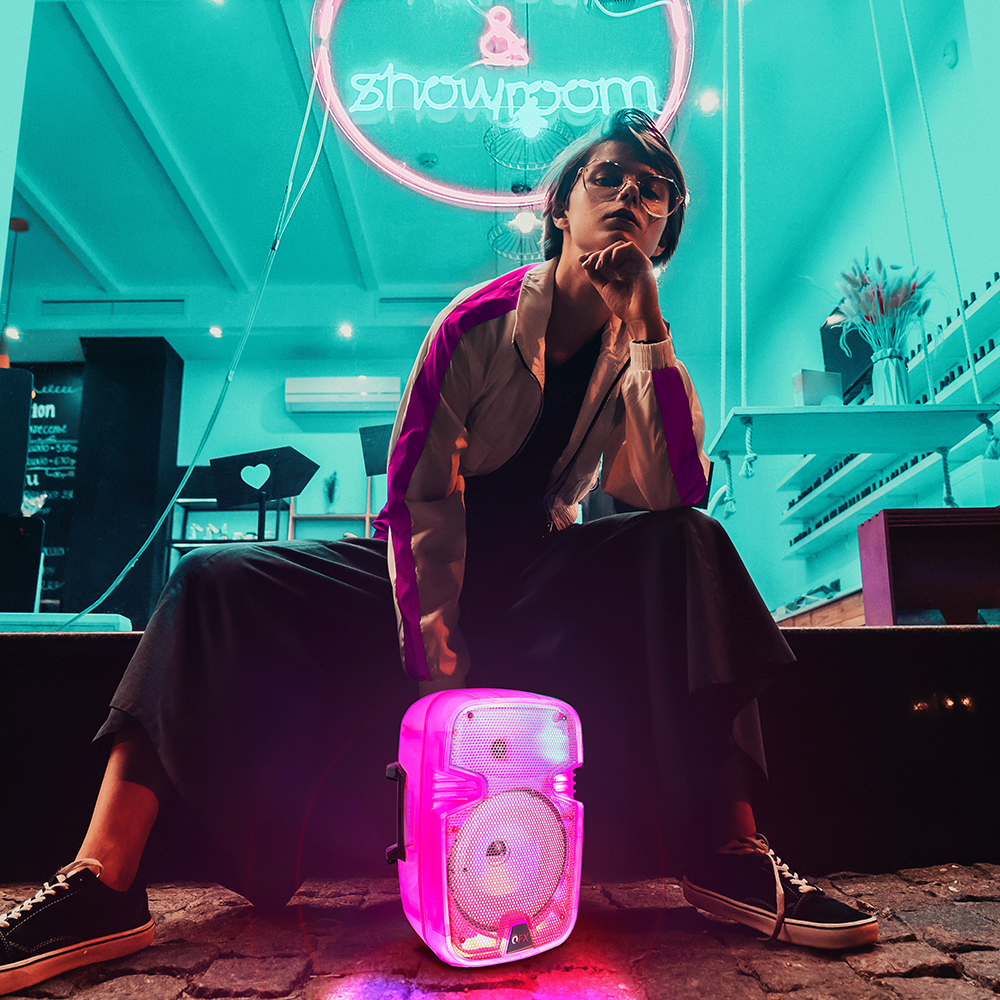8” PORTABLE BLUETOOTH RECHARGEABLE PARTY SPEAKER WITH TRANSLUCENT MOTION PARTY LIGHTS + REMOTE CONTROL